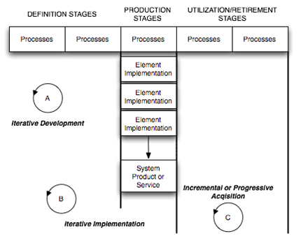 - Incremental or progressive acquisition involves releasing systems in the form of products and/or services to the consumers. This approach is appropriate when structural and capability (functions) changes are anticipated in a controlled manner after deployment. The use of this approach can be due to not knowing all of the requirements at the beginning, which leads to progressive acquisition/deployment, or due to a decision to handle the complexity of the system and its utilization in increments—namely, incremental acquisition. These approaches are vital for complex systems in which software is a significant system element. Each increment involves revisiting the definition and production stages. The utilization of these approaches must be based upon well-defined, agreed relationships between the supplying and acquiring enterprises. In fact, the iteration associated with each resulting product and/or service instance may well be viewed as a joint project, with actor roles being provided by both enterprises.