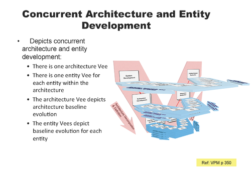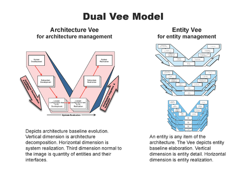 This is illustrated in the Dual Vee model (Figures 2a and 2b). The Dual Vee model is a three-dimensional system development model that integrates product and process in the creation of the system and component architectures. It emphasizes