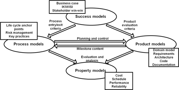 Spiral models concurrently engineer not only process and product models, but also property and success models. Figure 3 shows how these models provide checks and balances, both at milestone reviews and as individual model choices are made. Methods and tools supporting this concurrent engineering are provided in “When Models Collide: Lessons from Software System Analysis” (Boehm and Port 1999), “Avoiding the Software Model-Clash Spiderweb” (Boehm, Port, and Al-Said 2000), and “Detecting Model Clashes During Software Systems Development” (Al-Said 2003).