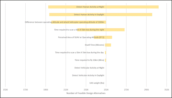 The tornado diagram seen in Figure 3 shows results of a one requirement at a time analysis. This makes it easy to see how the constraining/relaxing of each individual requirement affects the feasible tradespace. Figure 3 shows that the requirements “Detect Human Activity at Night” and “Detect Human Activity in Daylight” have the greatest impact on the feasible tradespace.