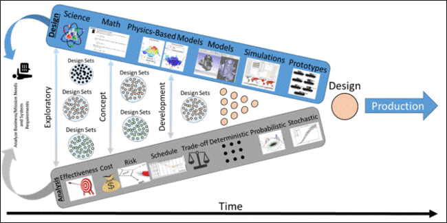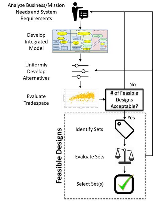 SBD is a social-technical process and should involve input and interactions from several teams, but Figure 6 provides a SBD tradespace exploration process for system analysts (Specking et al. 2019). This eight-step process is especially useful to perform early-stage design (Specking et al. 2018b). The system analyst starts by analyzing the business/mission needs and system requirements. Systems engineers use this information, along with models and simulations developed by themselves or provided by systems and subsystem teams, to develop an integrated model. Systems engineers include requirements to assess feasible and infeasible alternatives using this integrated model. They explore the tradespace by treating each design decision as a uniform (discrete or continuous) random variable. An alternative consists of an option from every design decision. Systems engineers then use the integrated model to evaluate each alternative and to create the feasible tradespace. Monte Carlo simulation is one method that enables a timely alternative creation and evaluation process. The created tradespace will consist of infeasible and feasible alternatives based upon the requirements and any physics-based performance models and simulations. Systems engineers should work with the appropriate stakeholders to inform requirements when the tradespace produces a significantly small number of or no feasible alternatives. In addition to feasibility, systems engineers should also analyze each design decision by using descriptive statistics and other analyses and data analytics techniques. This information provides insights into how each design factor influences the feasible tradespace. Once the tradespace contains an acceptable number of alternatives, it is then classified by sets. This is an essential part of SBD. If the set drivers or design factors are not known, systems engineers should view the tradespace by each design decision for insights. Systems engineers should use dominance analysis and other optimization methods to find optimal or near optimal alternatives based upon the measures of effectiveness. Systems engineers should explore the remaining sets for additional insights on the feasible tradespace and the requirements. The final part of this process is to select one or more sets to move to the next design-stage. It should be noted that this process contains cycles. At any part of this process, systems engineers should use the available information, such as from tradespace exploration or set evaluation, to inform requirement analysis or update the integrated model. Additionally, the systems engineer should update the integrated model with higher fidelity models and simulations as they become available. The key is to have the “right” information from the “right” people at the “right” time.