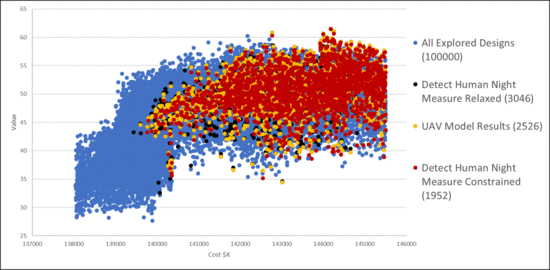 Changing the requirements does not always translate to finding improved designs. The individual one requirement at a time analysis scatterplot provides important information, as seen in an example illustration in Figure 4. It is important to carefully analyze the Pareto Frontier created by each change (represented by a different color) and compare it to the Pareto Frontier of the original analysis. If the original requirement level produces better alternatives, then it does not make sense to change (constrain or relax) the requirement.