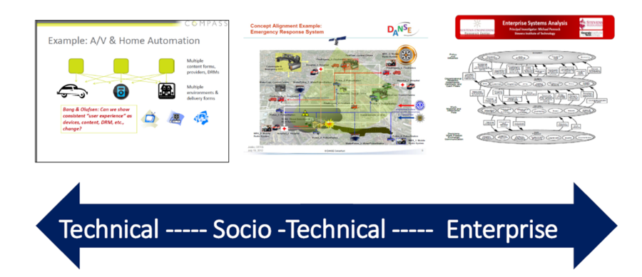 In some cases, SoS may focus almost entirely on technical integration with an example from an early European Commission (EC) research project COMPASS [Fitzgerald et al., 2012] which used as a case study in SoS the integration of the components of a consumer audio-visual ‘system’. In other cases, there are socio-technical systems of systems where not only are the systems integral to the SoS capability but also the organizations and their processes. The figure shows the example of a disaster response SoS, a case example developed by the DANSE [Lochow, 2016] project. Finally, broader SoS address the scale and scope of enterprise level concerns. The example in the figure is the case of counterfeiting as an enterprise comprised of a wide variety of systems, organizations, policies, and competing efforts. [Bodner, 2015]